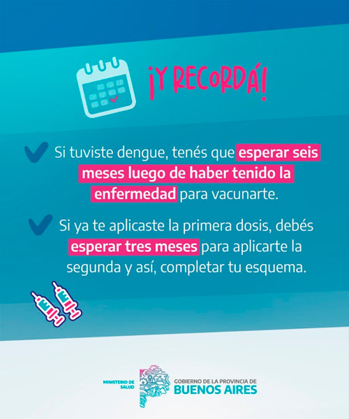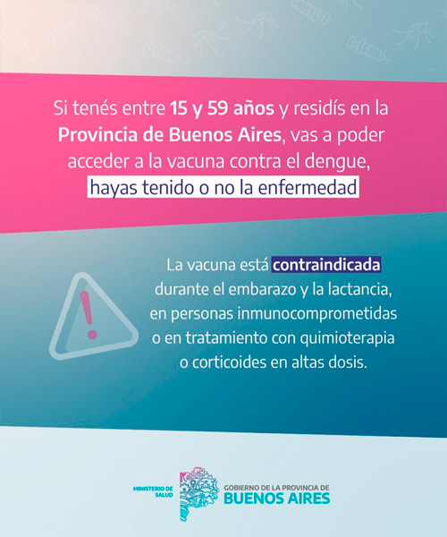 La Provincia de Buenos Aires inició la campaña de vacunación gratuita contra el dengue para personas de 15 a 59 años (hayas tenido o no la enfermedad). La vacuna contribuye a protegerte frente a la enfermedad y disminuir el riesgo de cuadros graves.